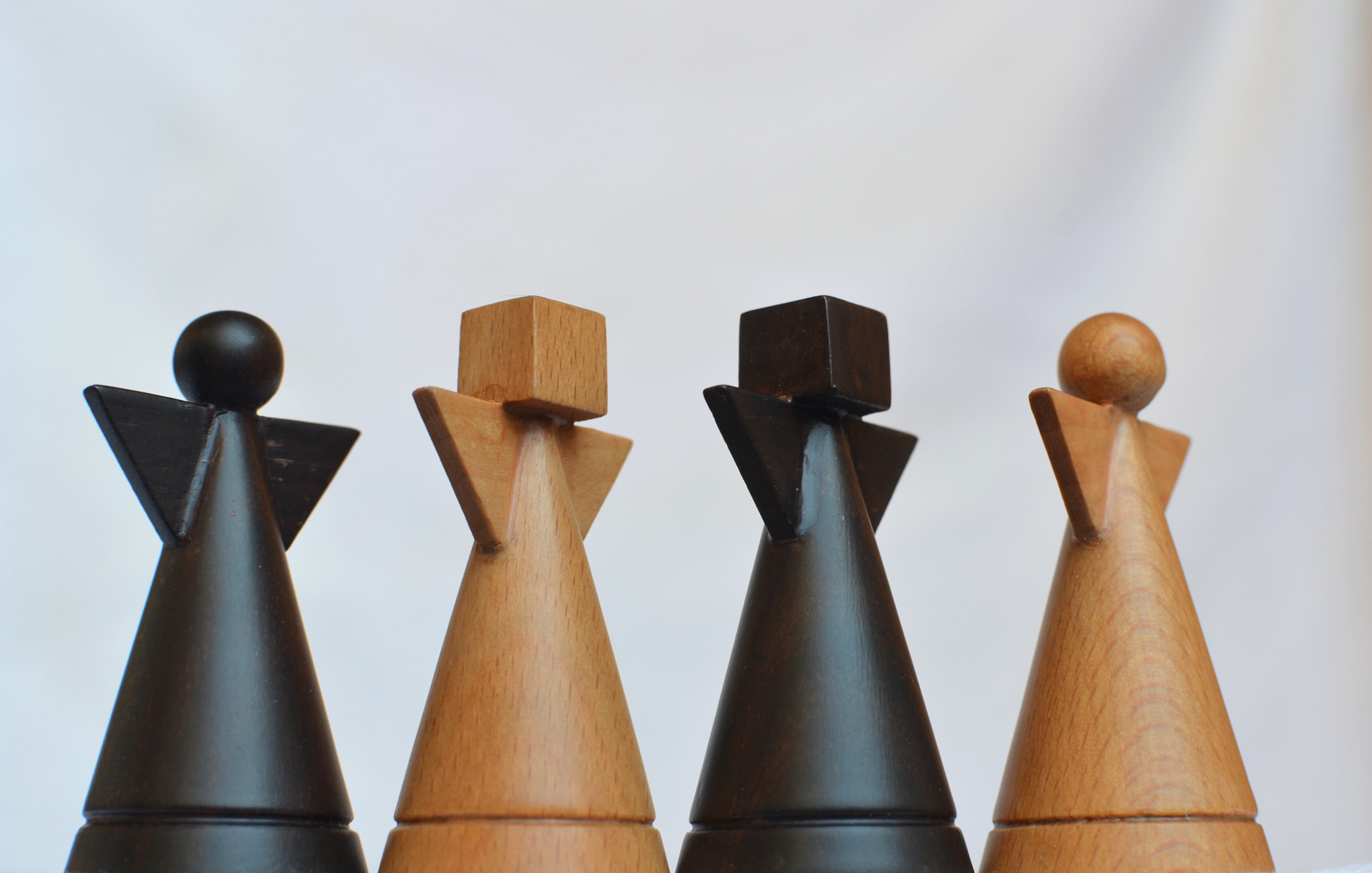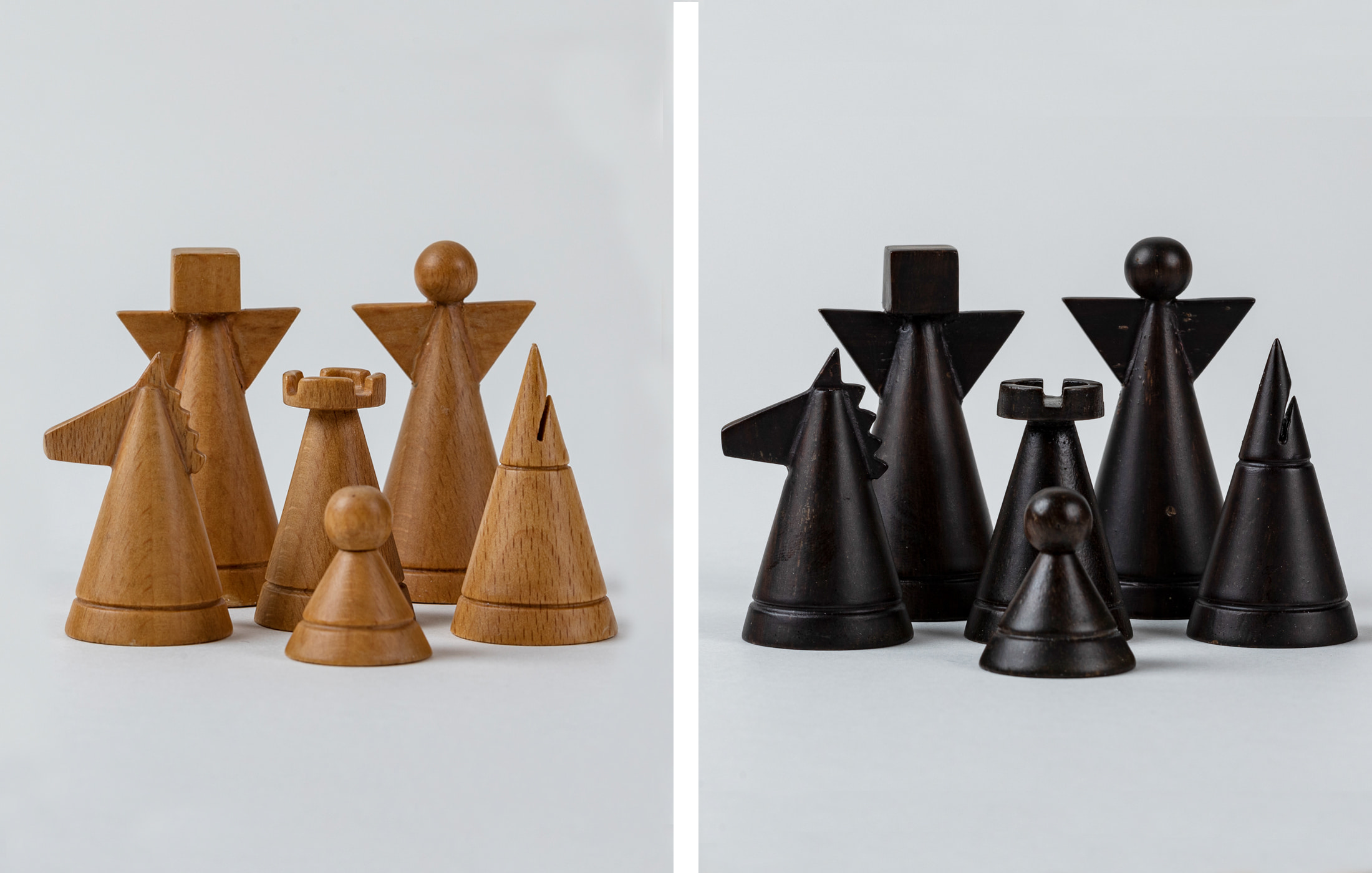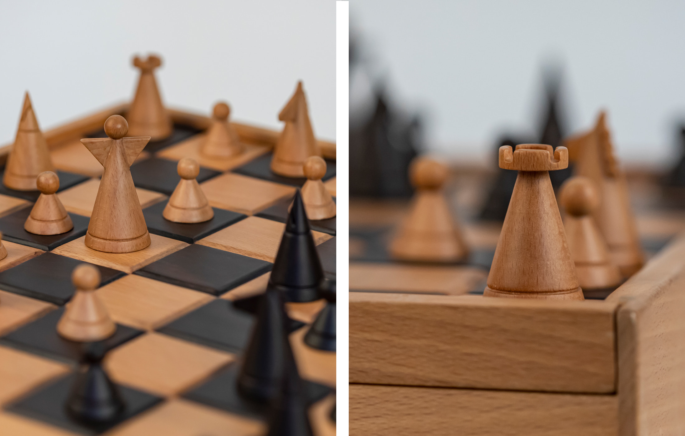 A chess set was created from the pieces designed in the book. The carefully crafted, minimalist pieces with a common conical base came to life from a 2 to a 3-dimensional form. This custom chess set is crafted in Rosewood and White beach.