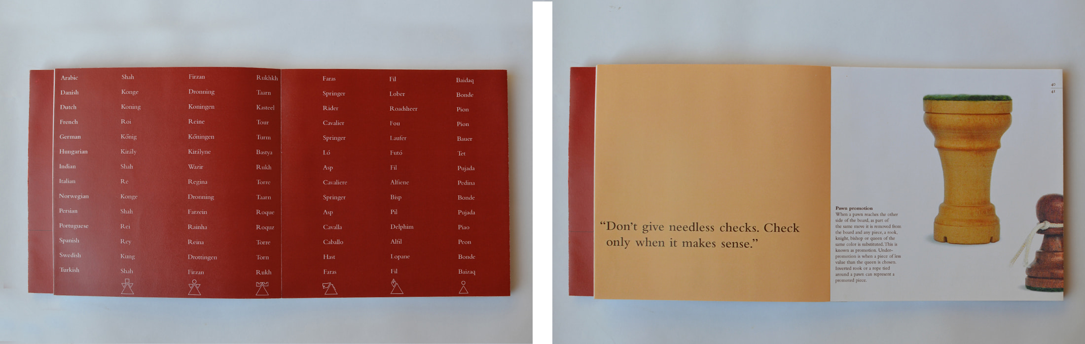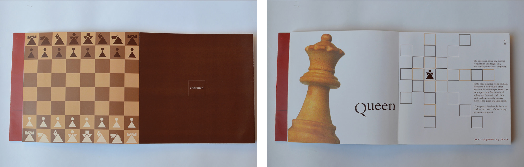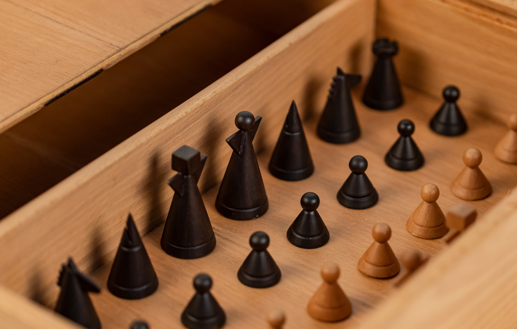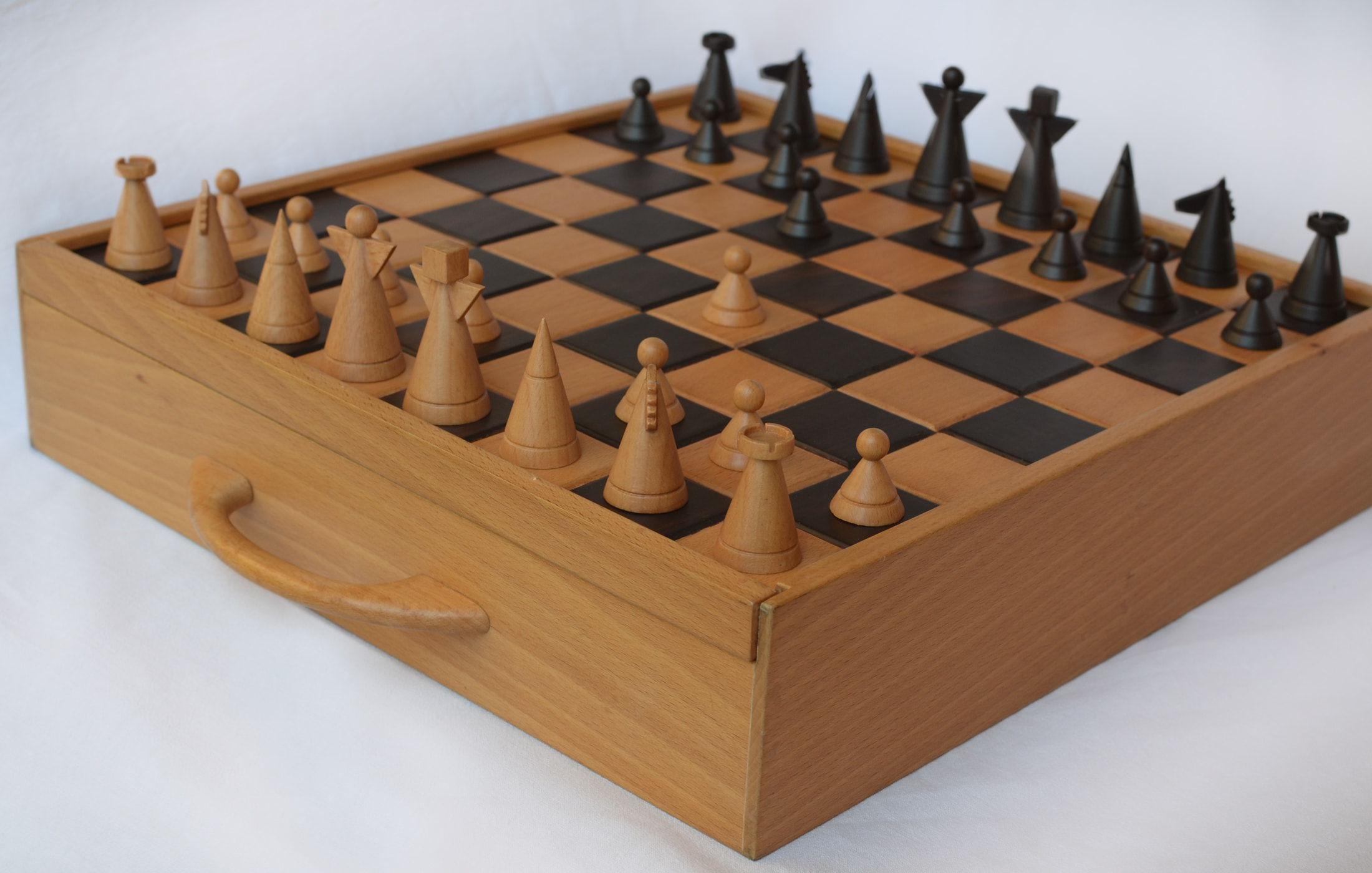 A chess set was created from the pieces designed in the book. The carefully crafted, minimalist pieces with a common conical base came to life from a 2 to a 3-dimensional form. This custom chess set is crafted in Rosewood and White beach.