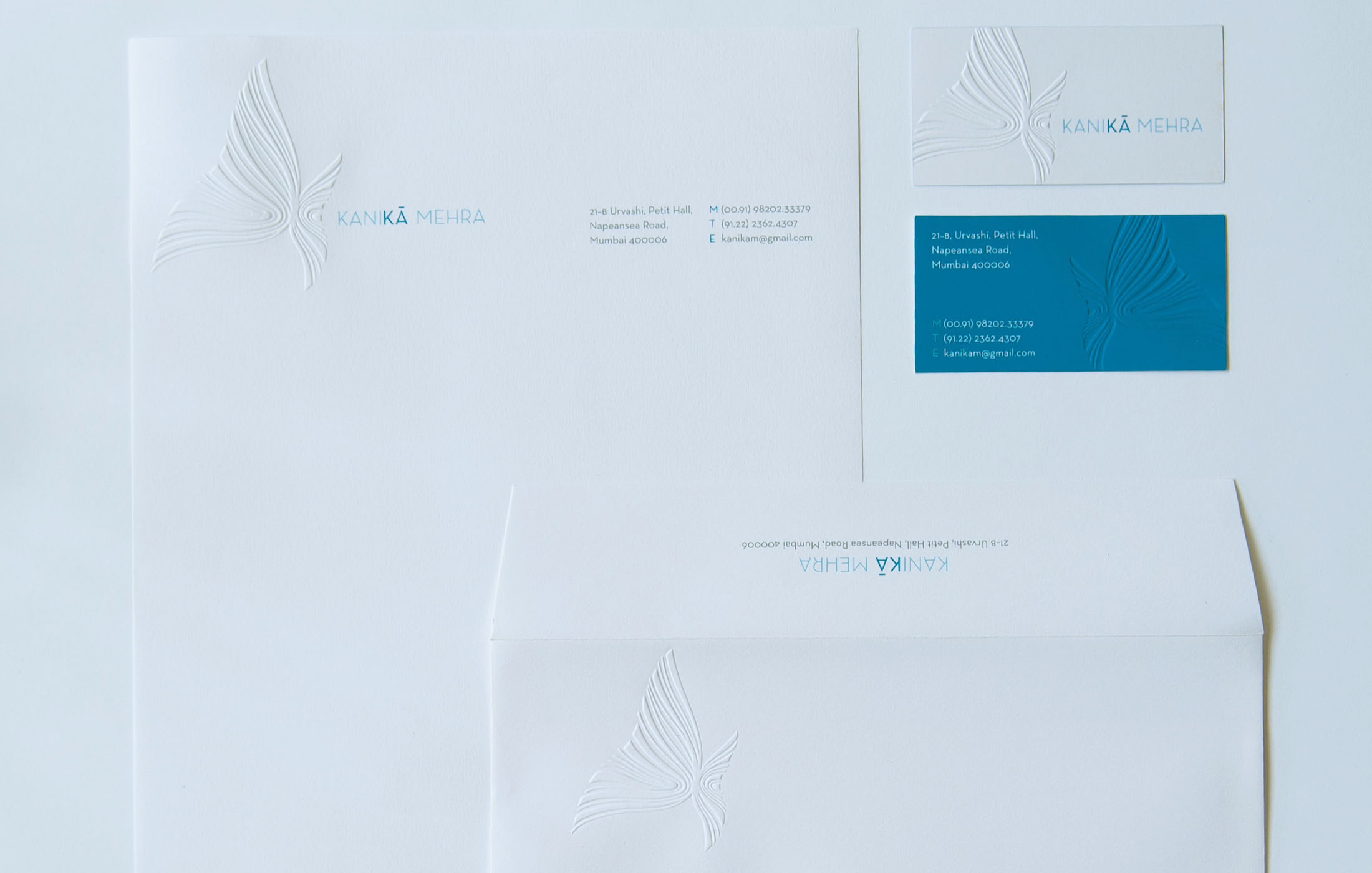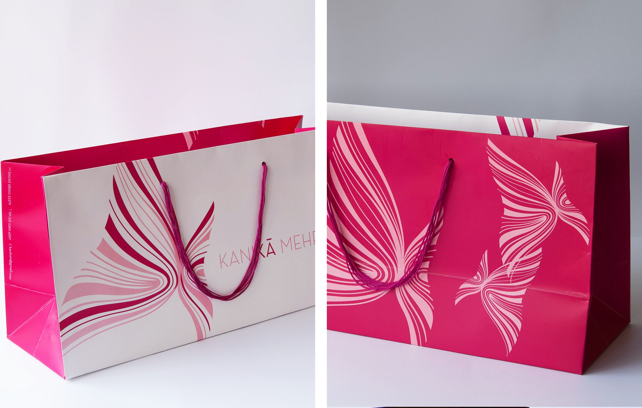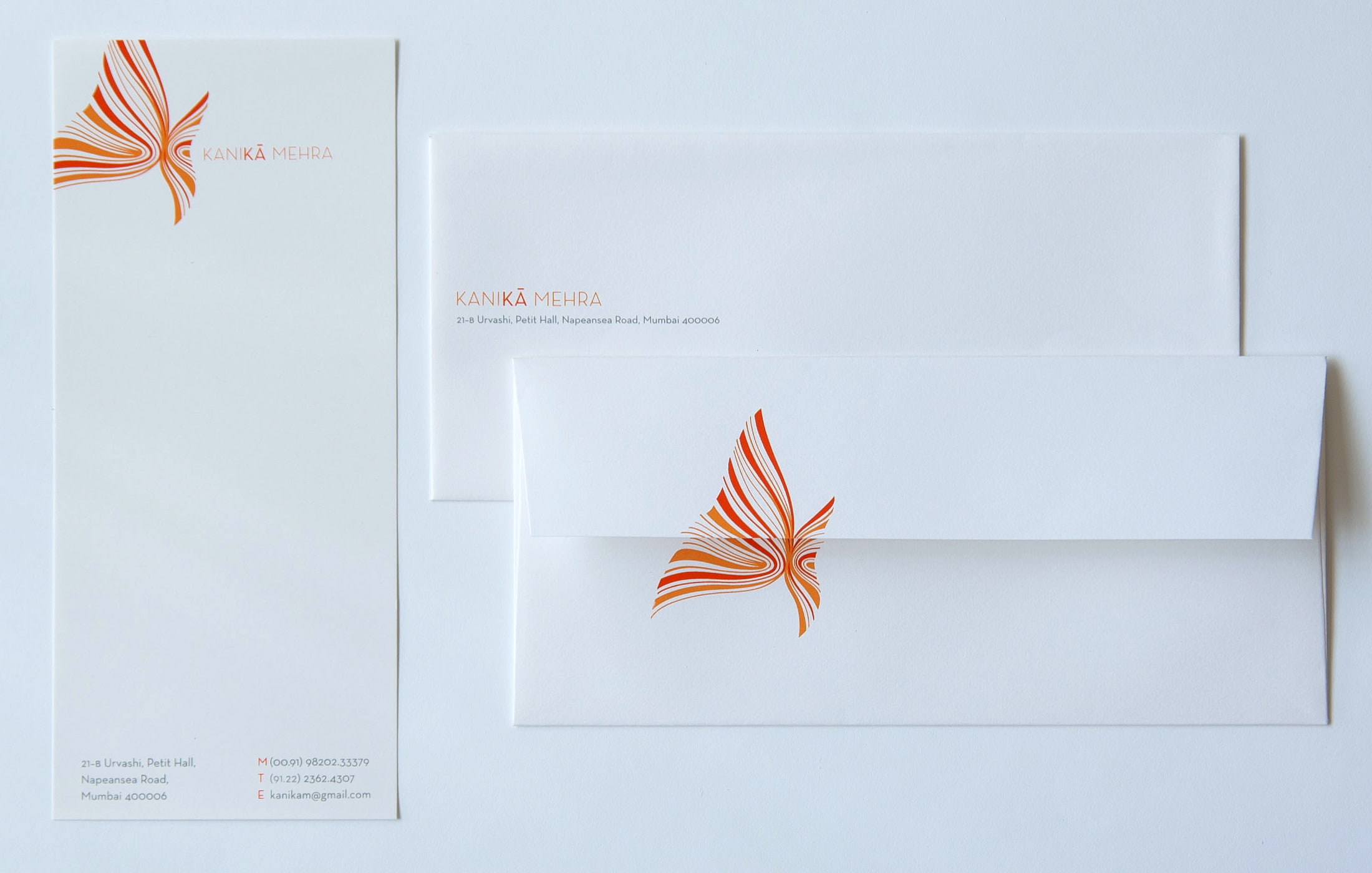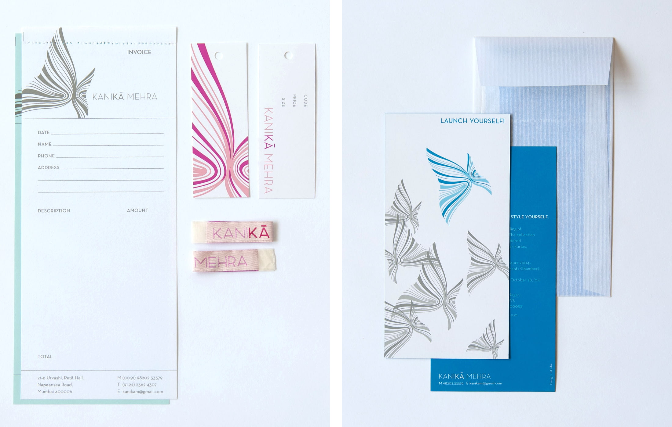 The form of a butterfly was chosen in the brand identity to represent the transformation a woman goes through once she wears beautifully crafted clothes. The strokes in the form are inspired by the look and feel of thread embroidered on cloth, while the outer shape forms the curves of a woman’s body.