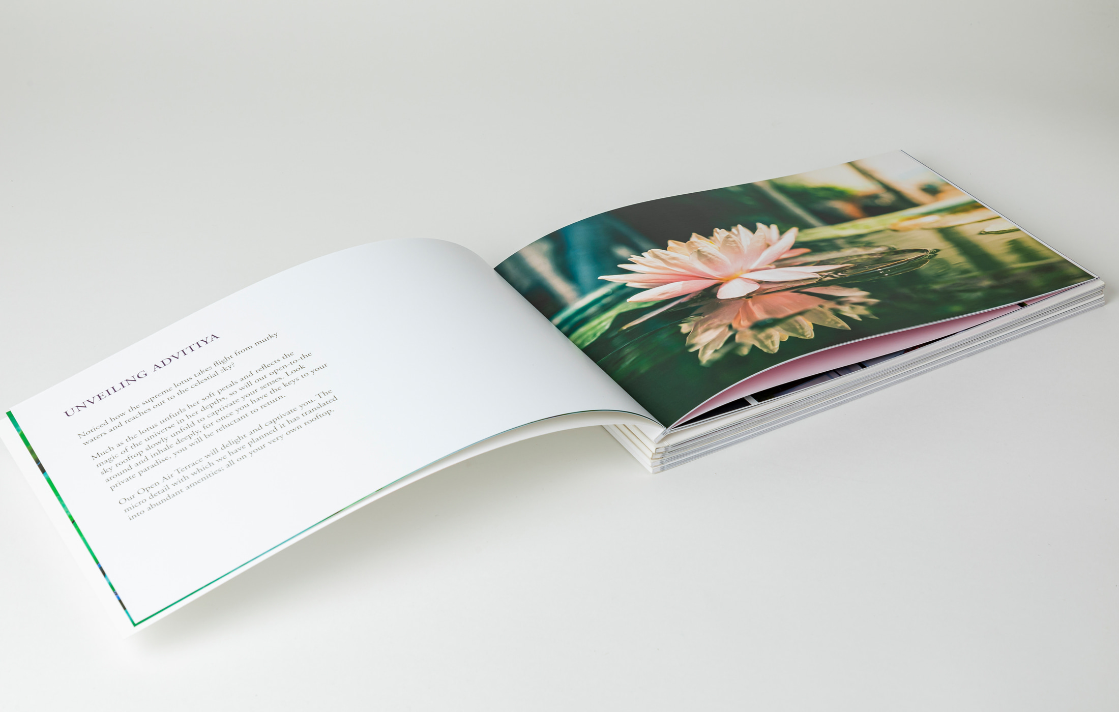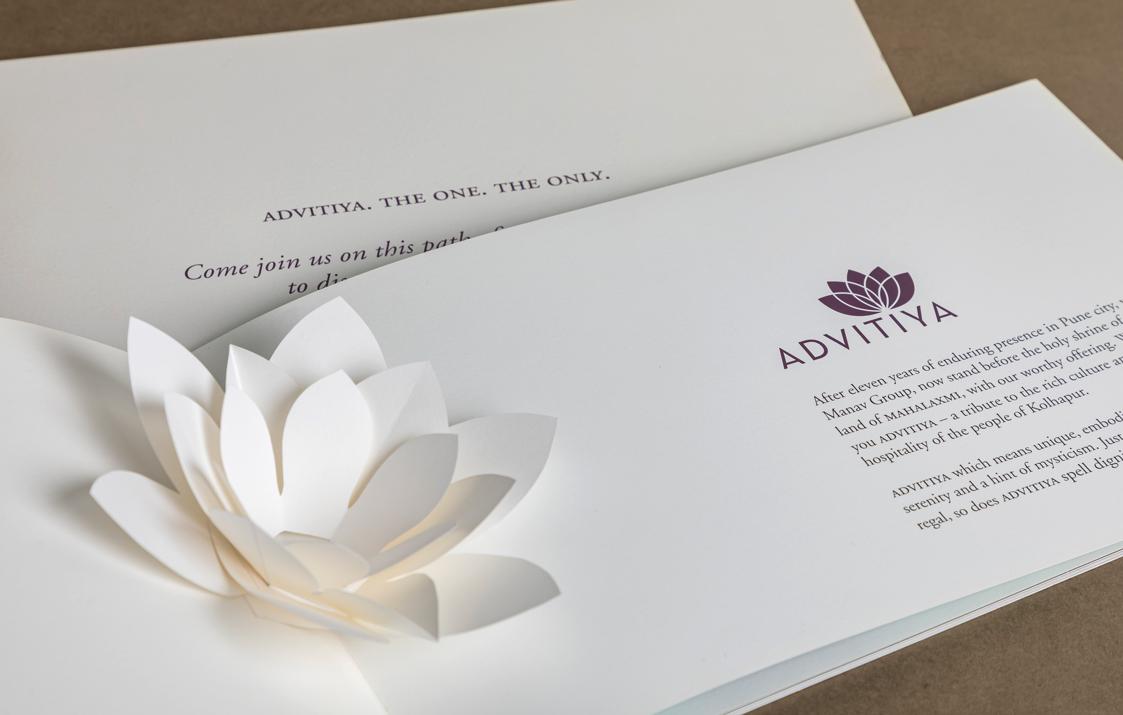 For their residential project they tasked mCube with creating an identity that would evoke a feeling of better living and sophistication for the residents of Kolhapur. We came up with the name ‘Advitiya’ which means unique or one of a kind. Something that does not have a second. The name is a perfect fit for a building that is built in a unique manner where the amenities opened up to the sky, like the lotus flower.