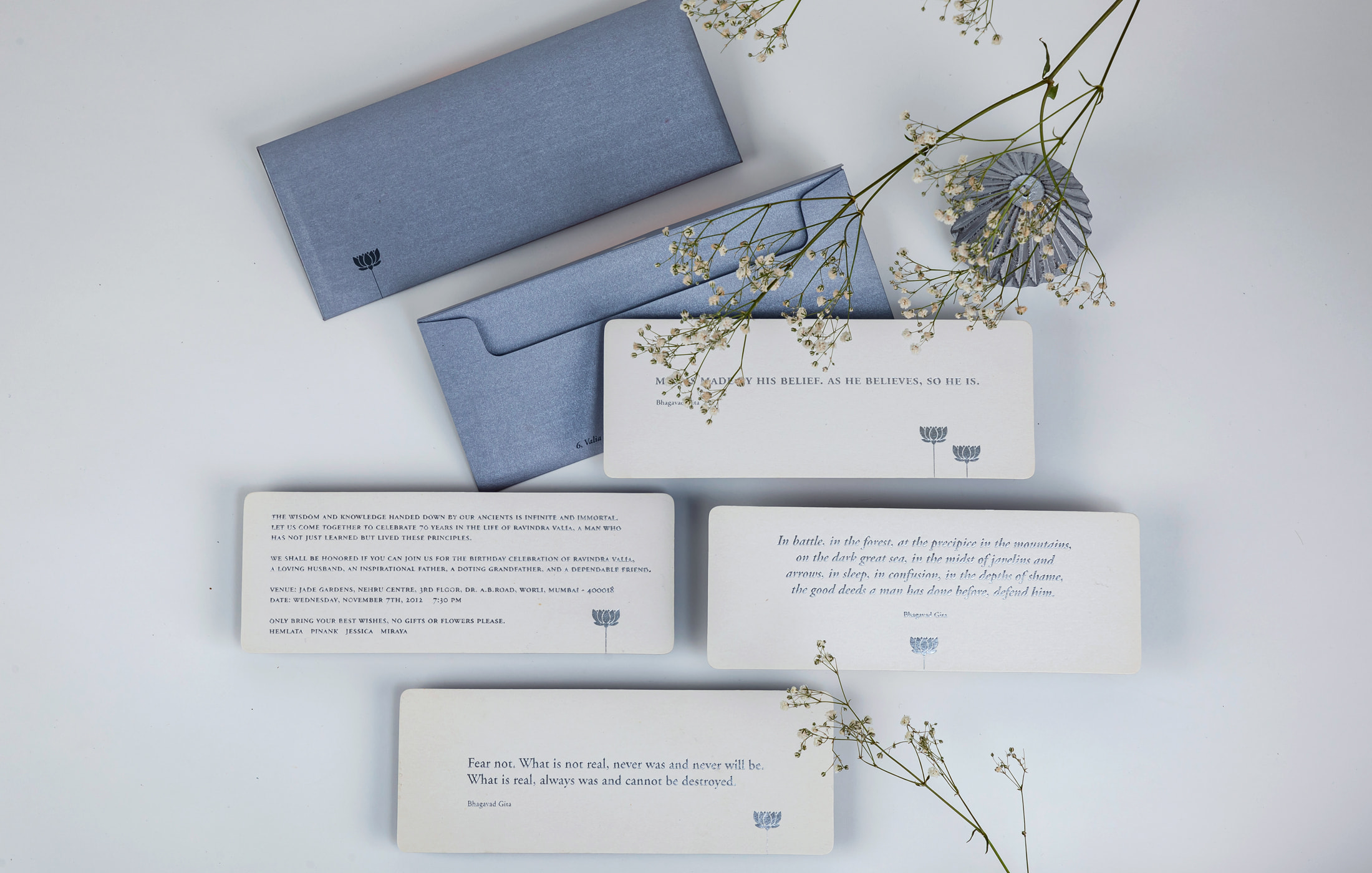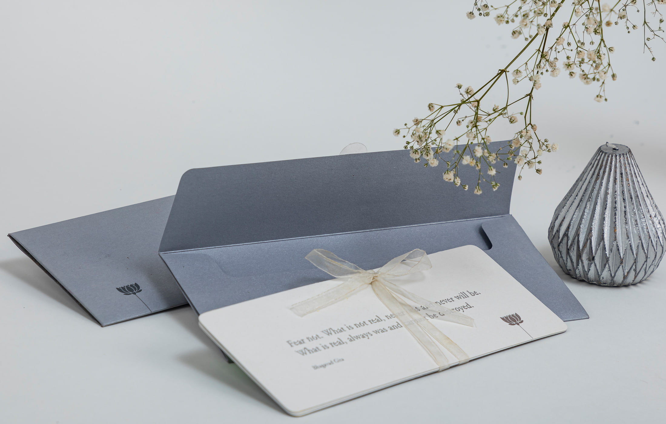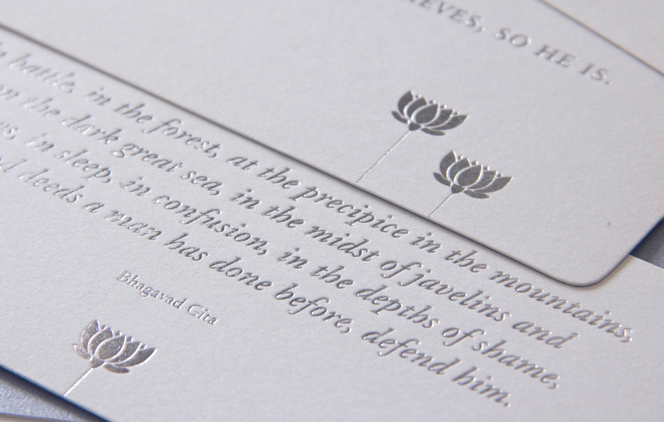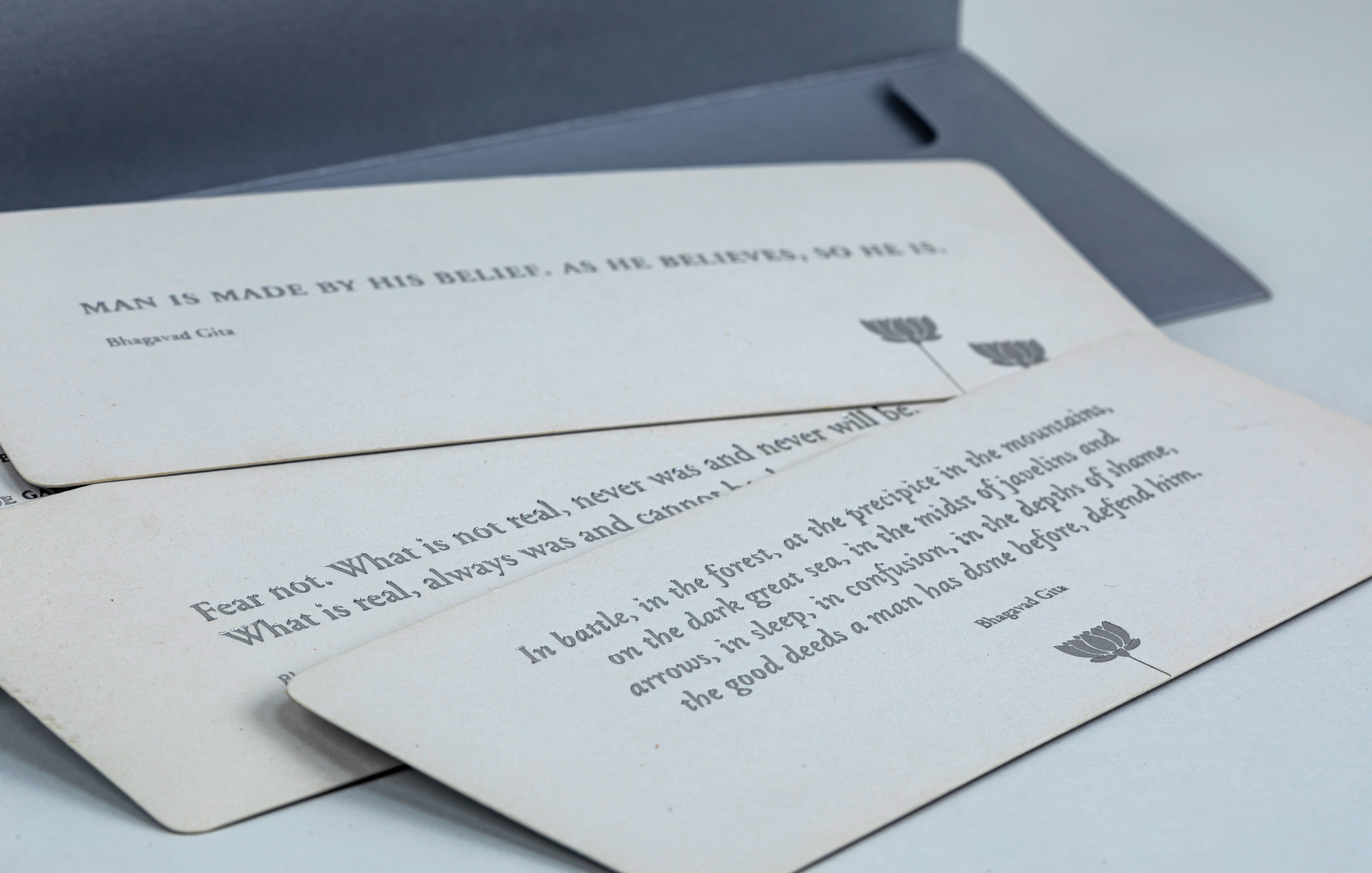 Quotes from Bhagavad Gita are used in the invitation. These cards are designed to allow flexibility of use either as a book mark or just a reminder.