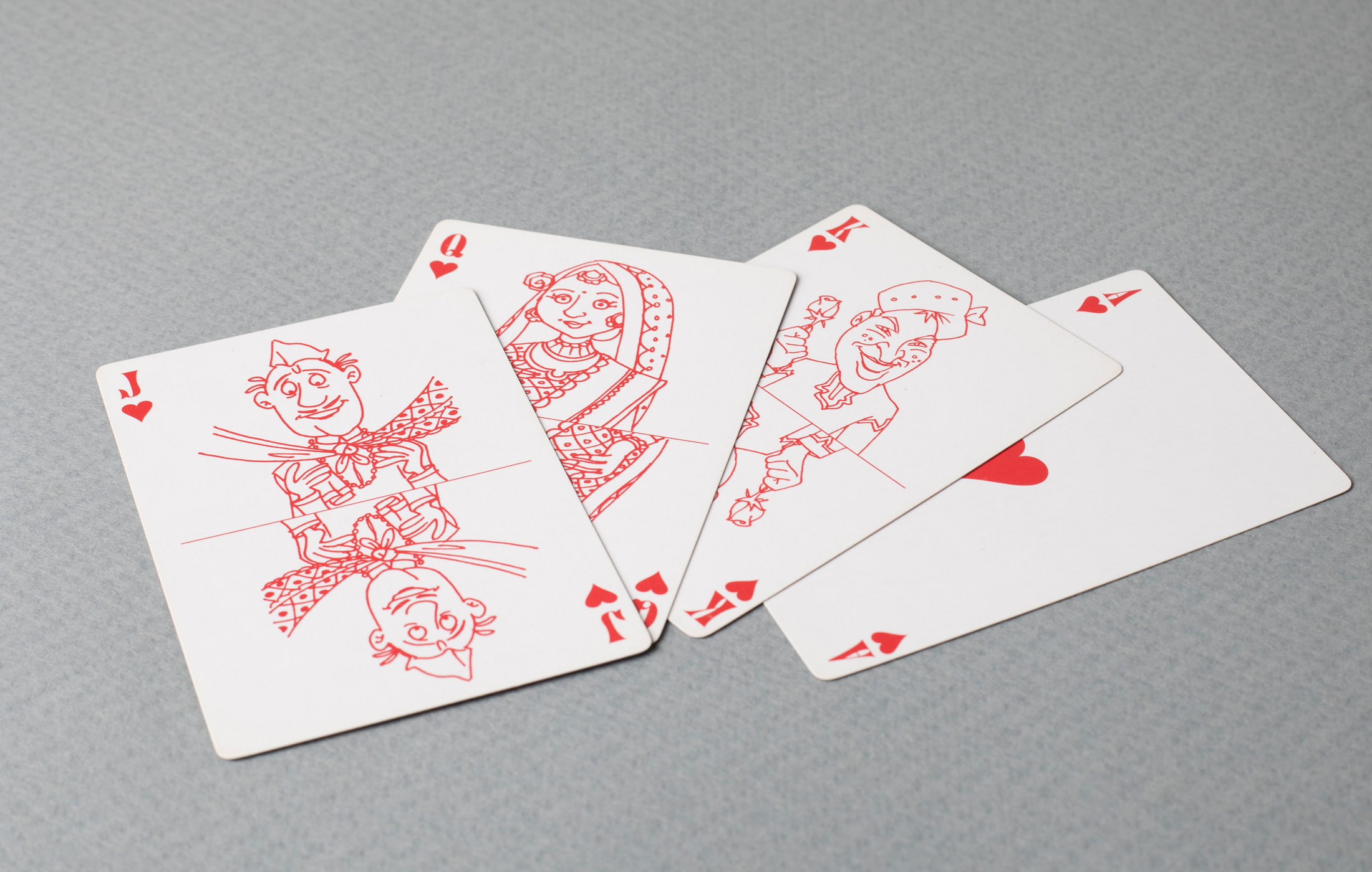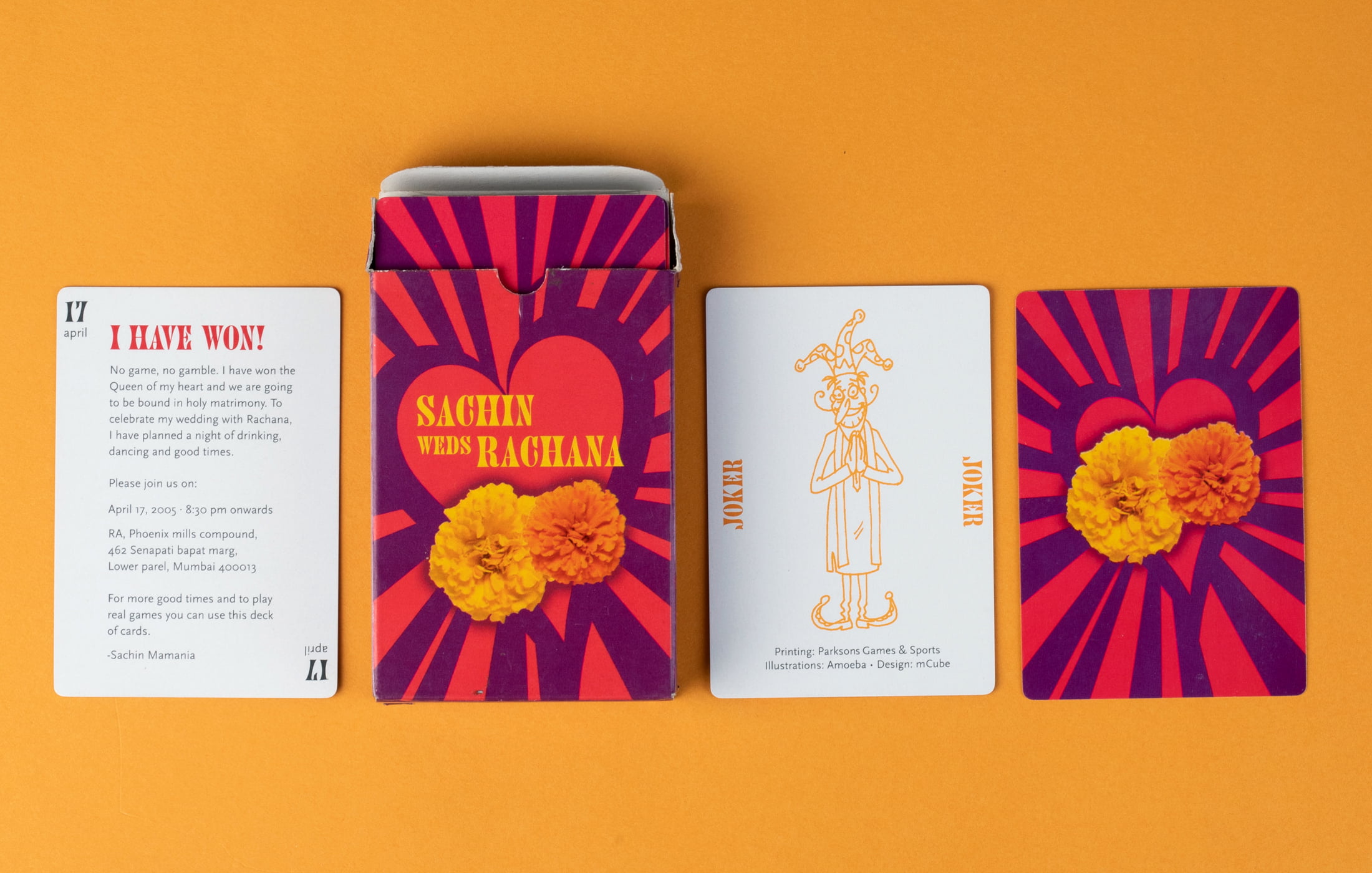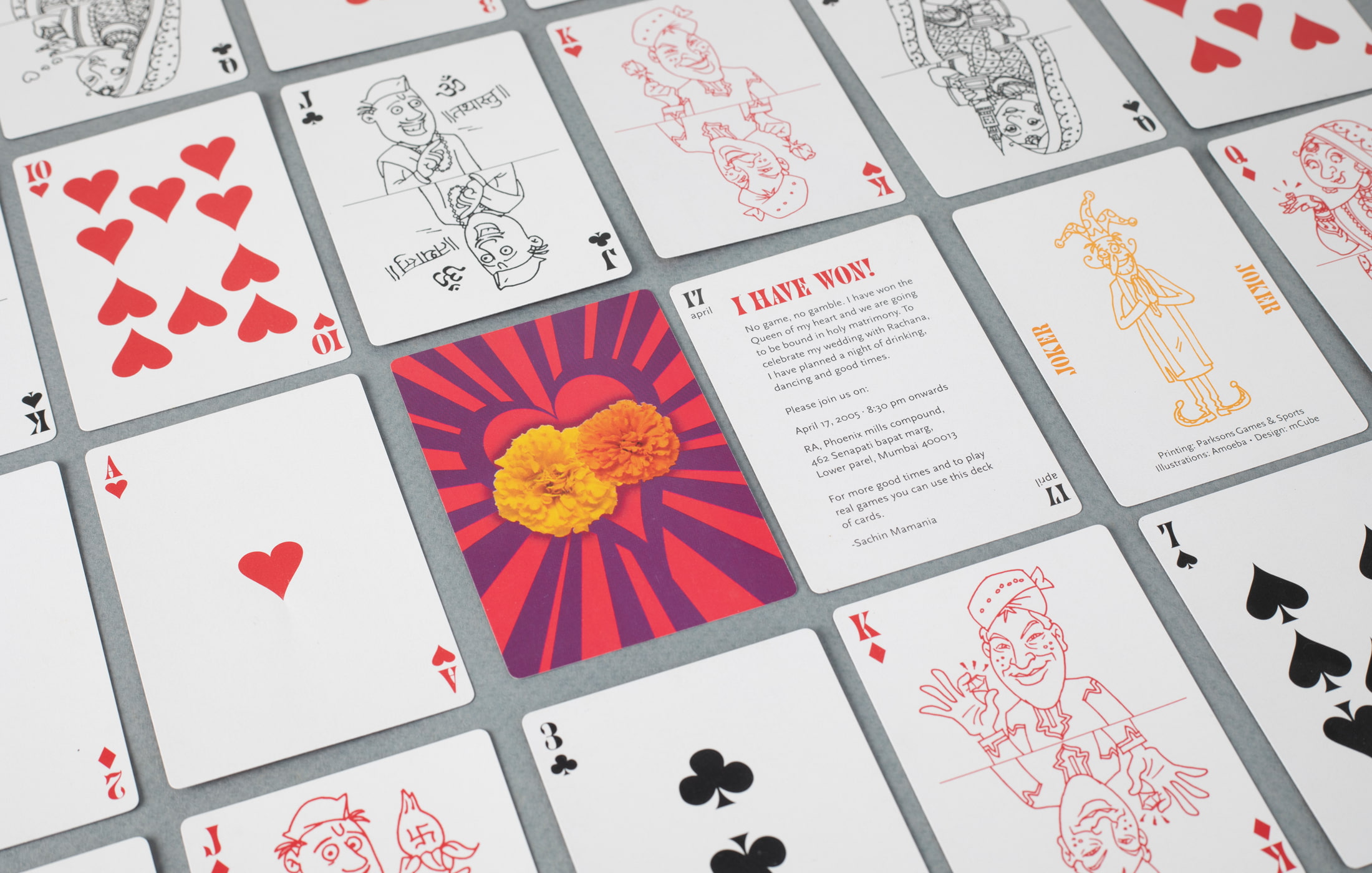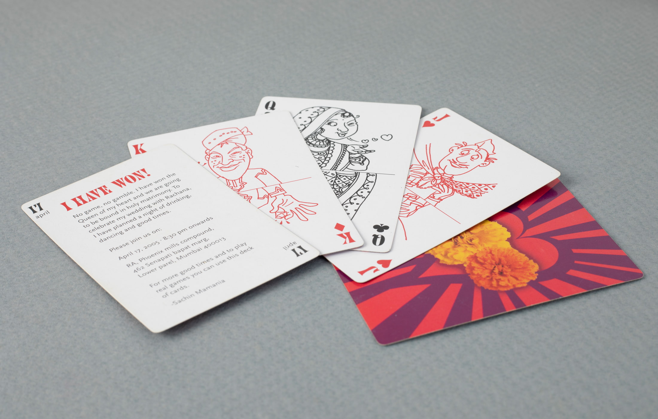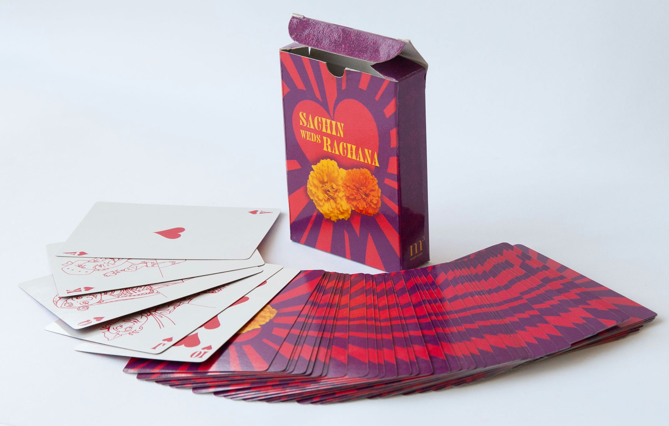 The invitation consisted of a custom-designed deck of cards where all the Kings, Queens, and Jacks were replaced by caricatures of the groom, the bride and the priest respectively. The Jokers are dressed in a traditional Indian outfits and sporting a ‘namaste’ to welcome the guests.