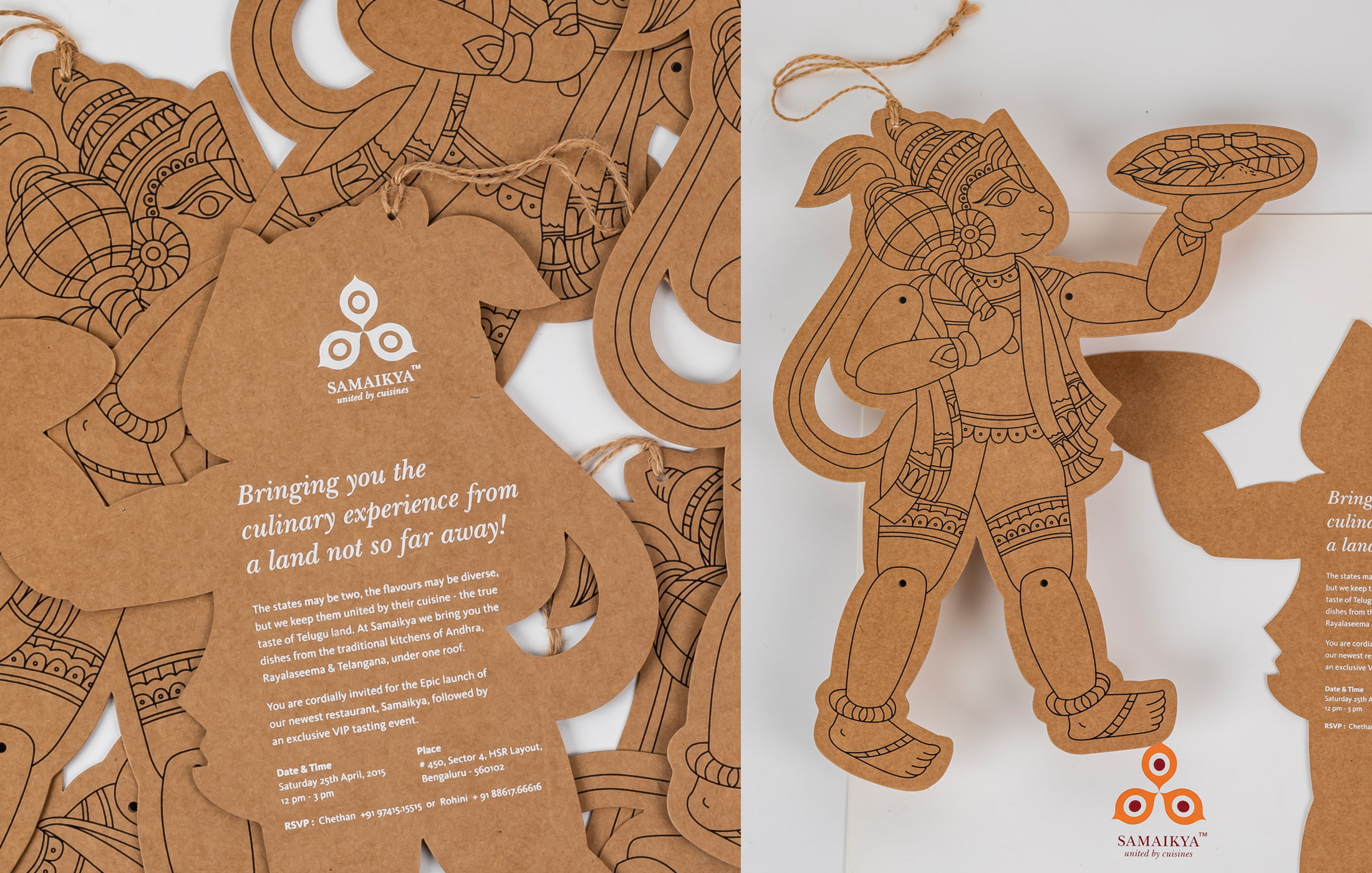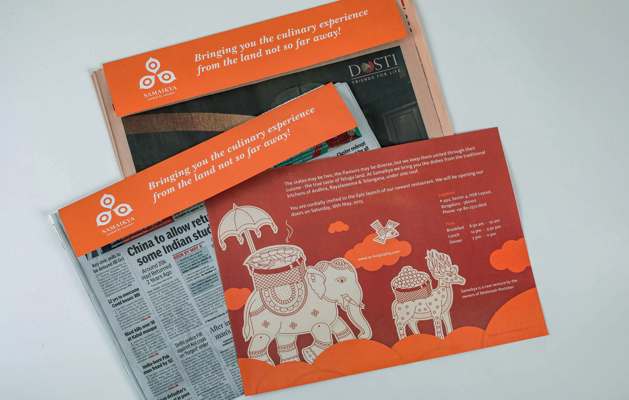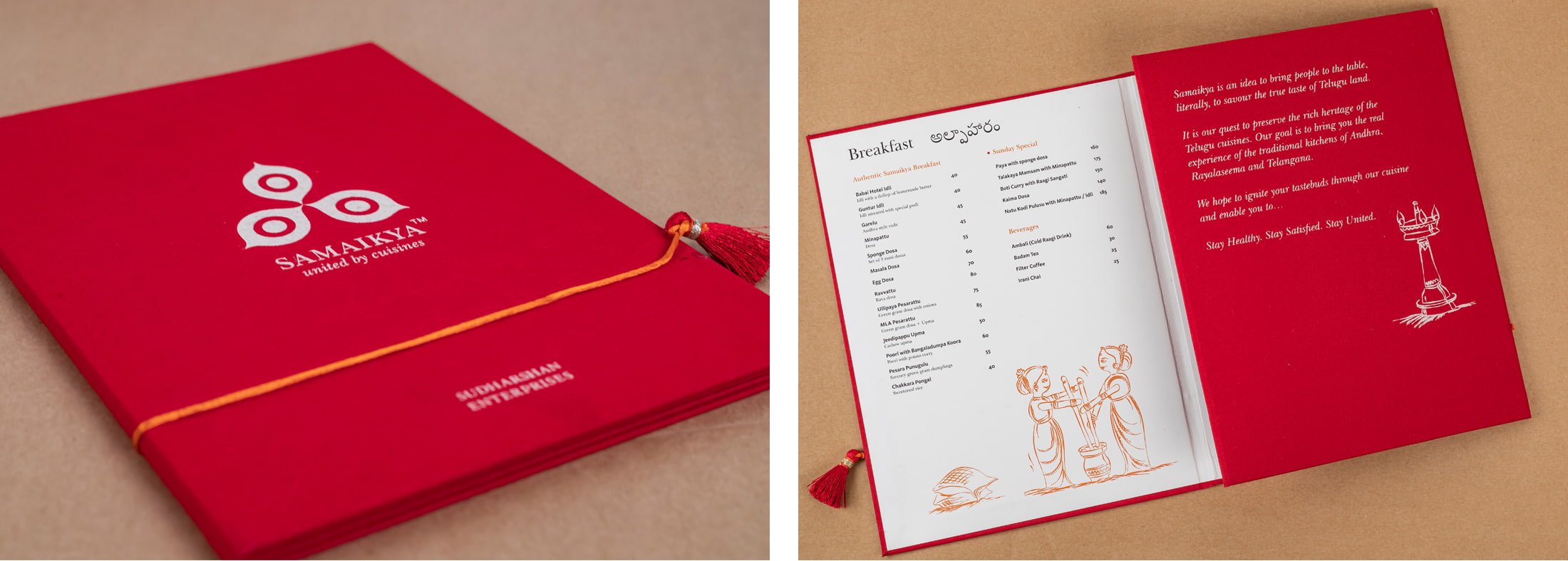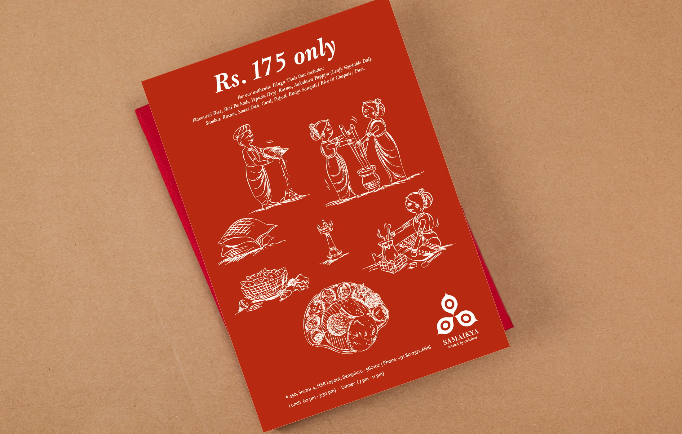 mCube created a visual language, which is based on the premise of Samaikya, meaning ‘united and equal’. Serving the cuisine of 3 regions of Andhra, the symbol represents unity and the form is inspired by the ‘gongura’ leaf, typically found in that region. In the communication pieces, traditional Andhra art forms like Tholu Bommalata, Kolam and Kondapalli have been used.