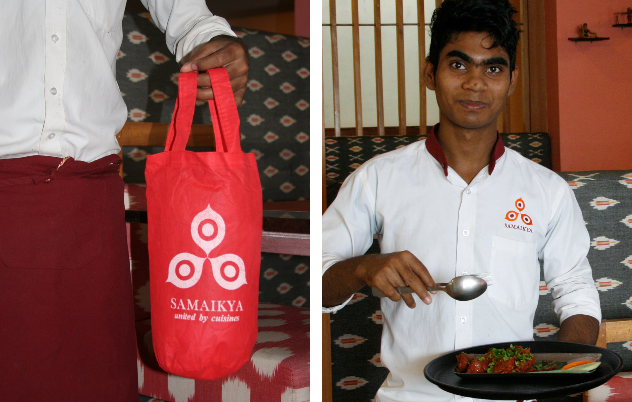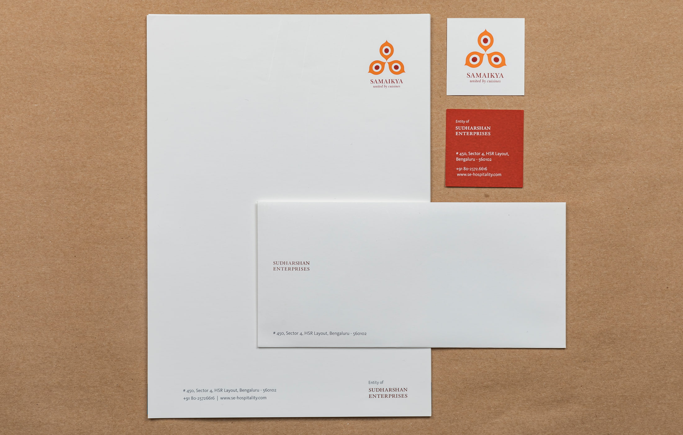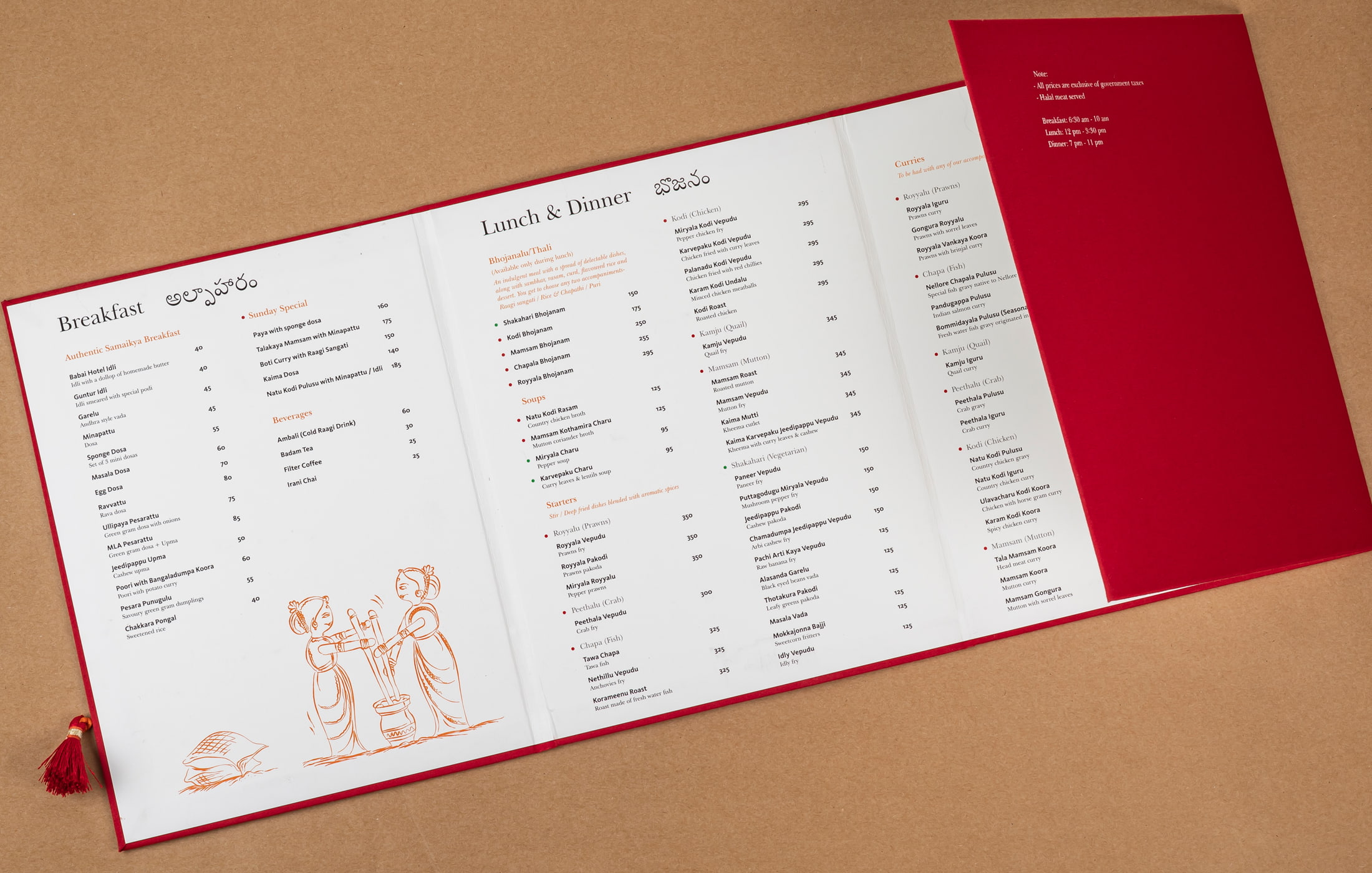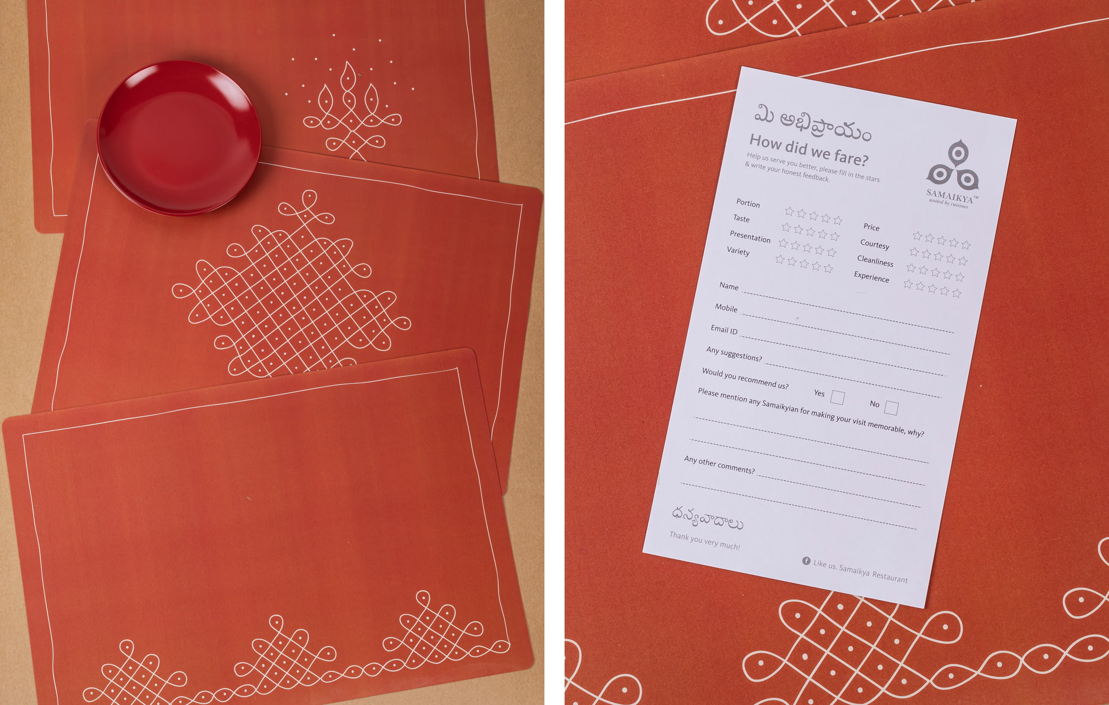 mCube created a visual language, which is based on the premise of Samaikya, meaning ‘united and equal’. Serving the cuisine of 3 regions of Andhra, the symbol represents unity and the form is inspired by the ‘gongura’ leaf, typically found in that region. In the communication pieces, traditional Andhra art forms like Tholu Bommalata, Kolam and Kondapalli have been used.